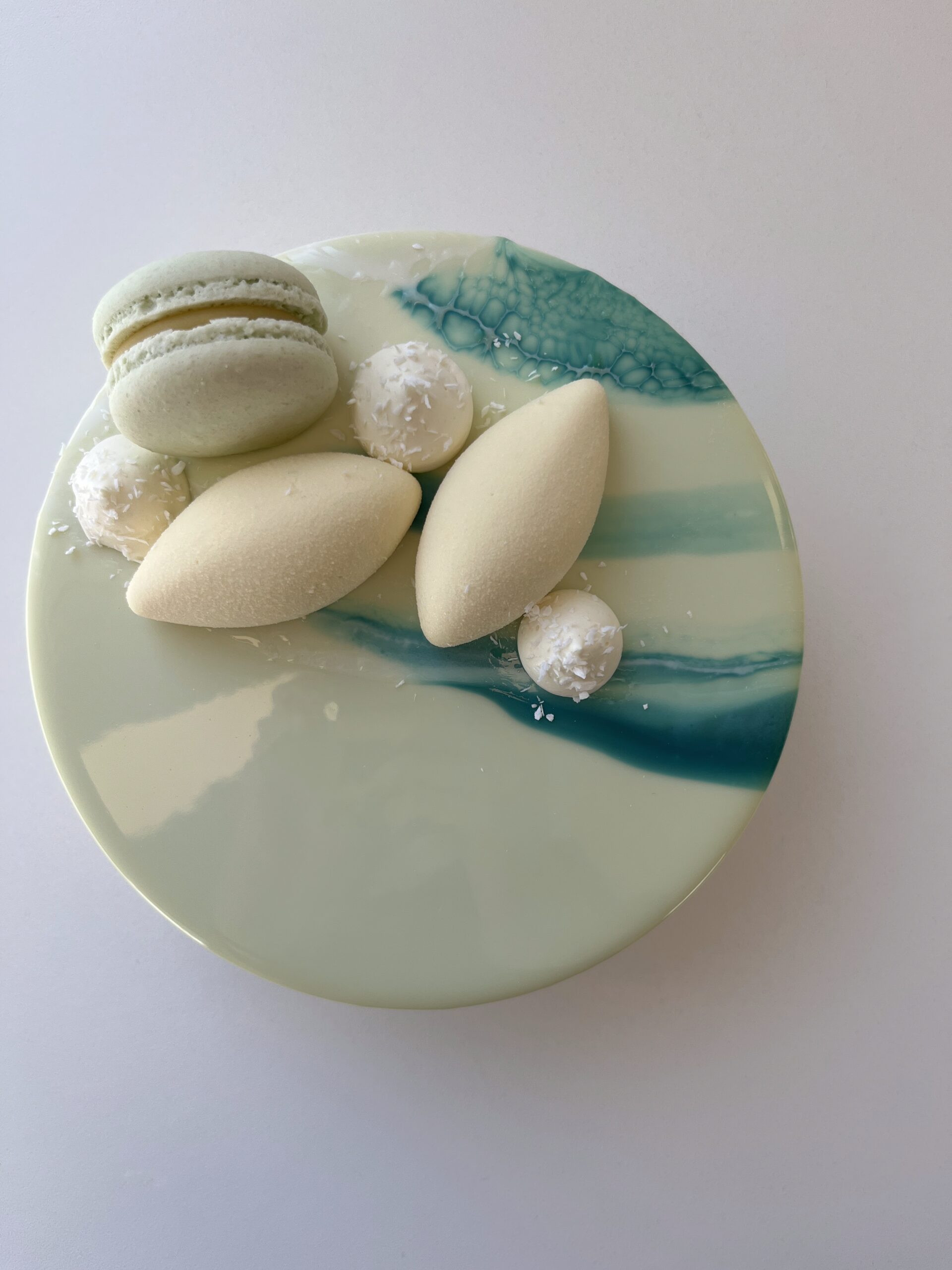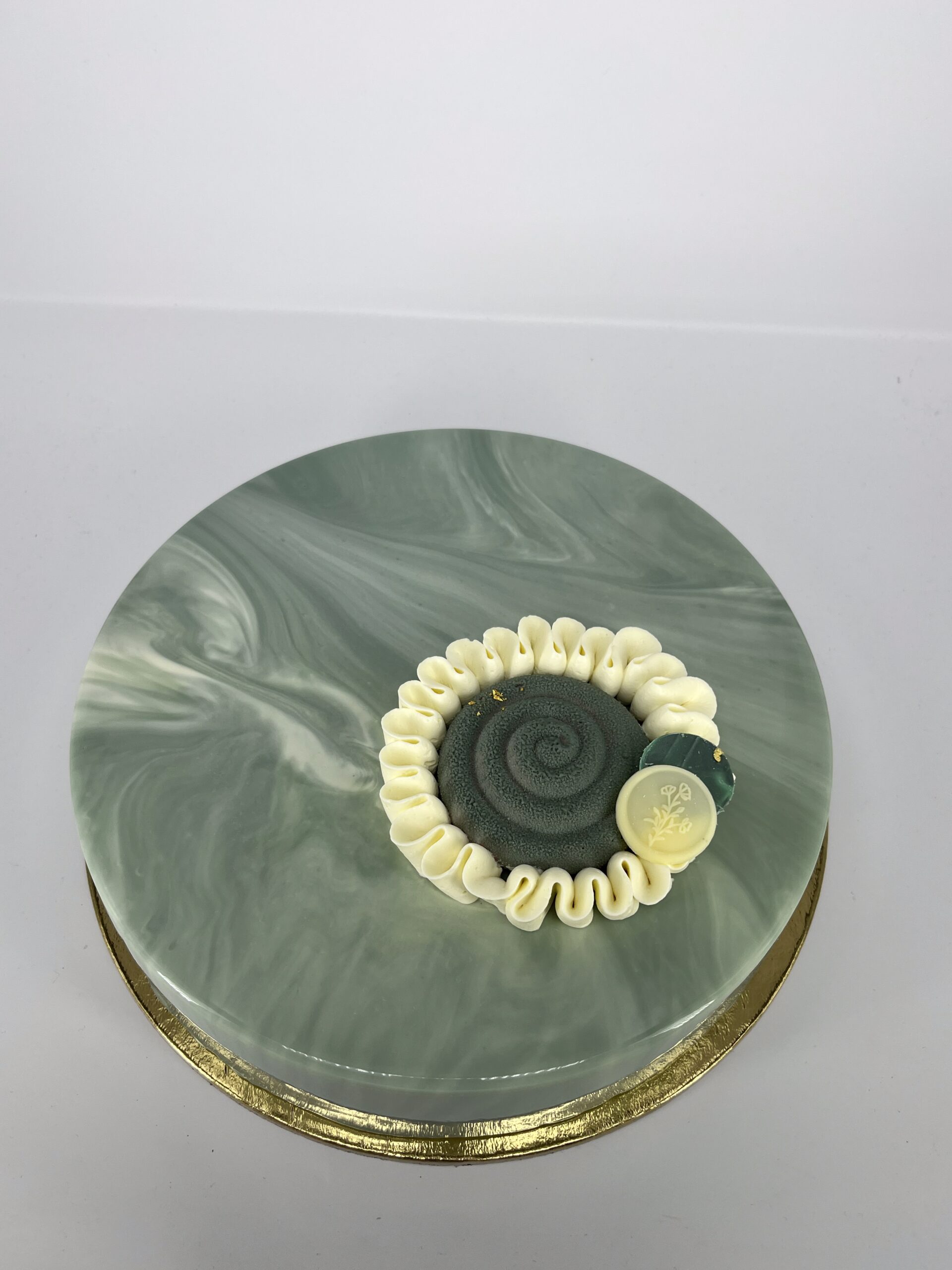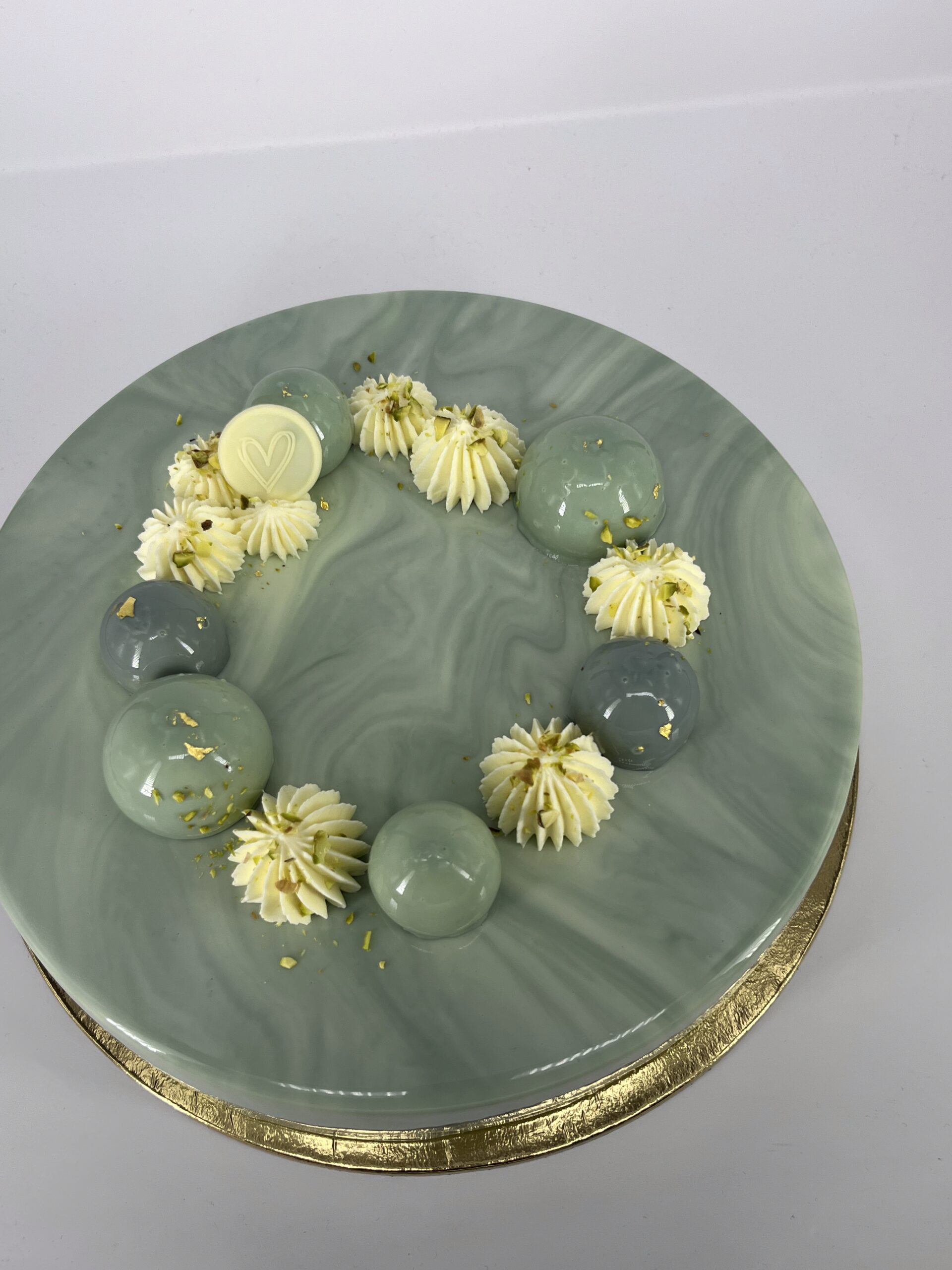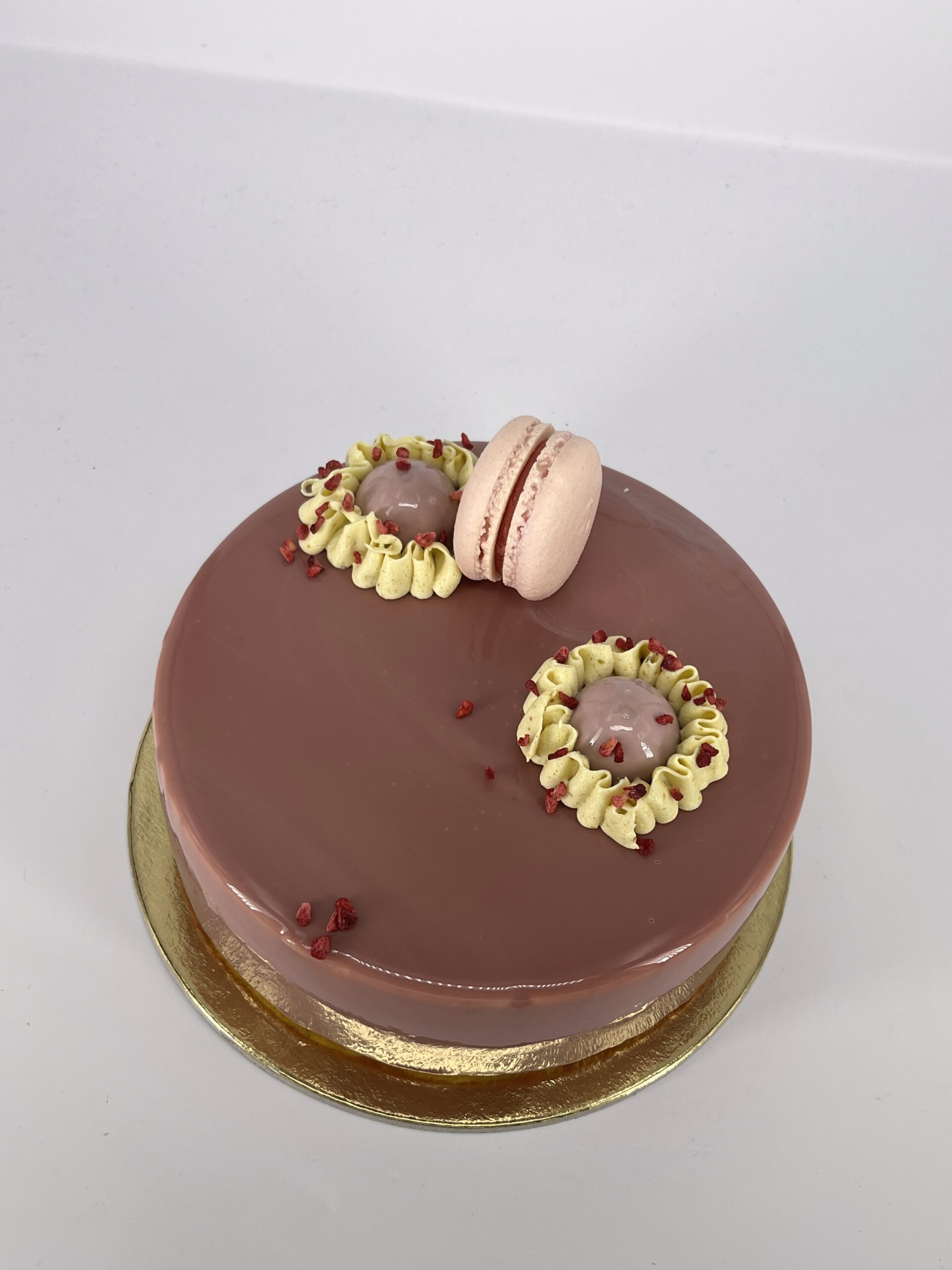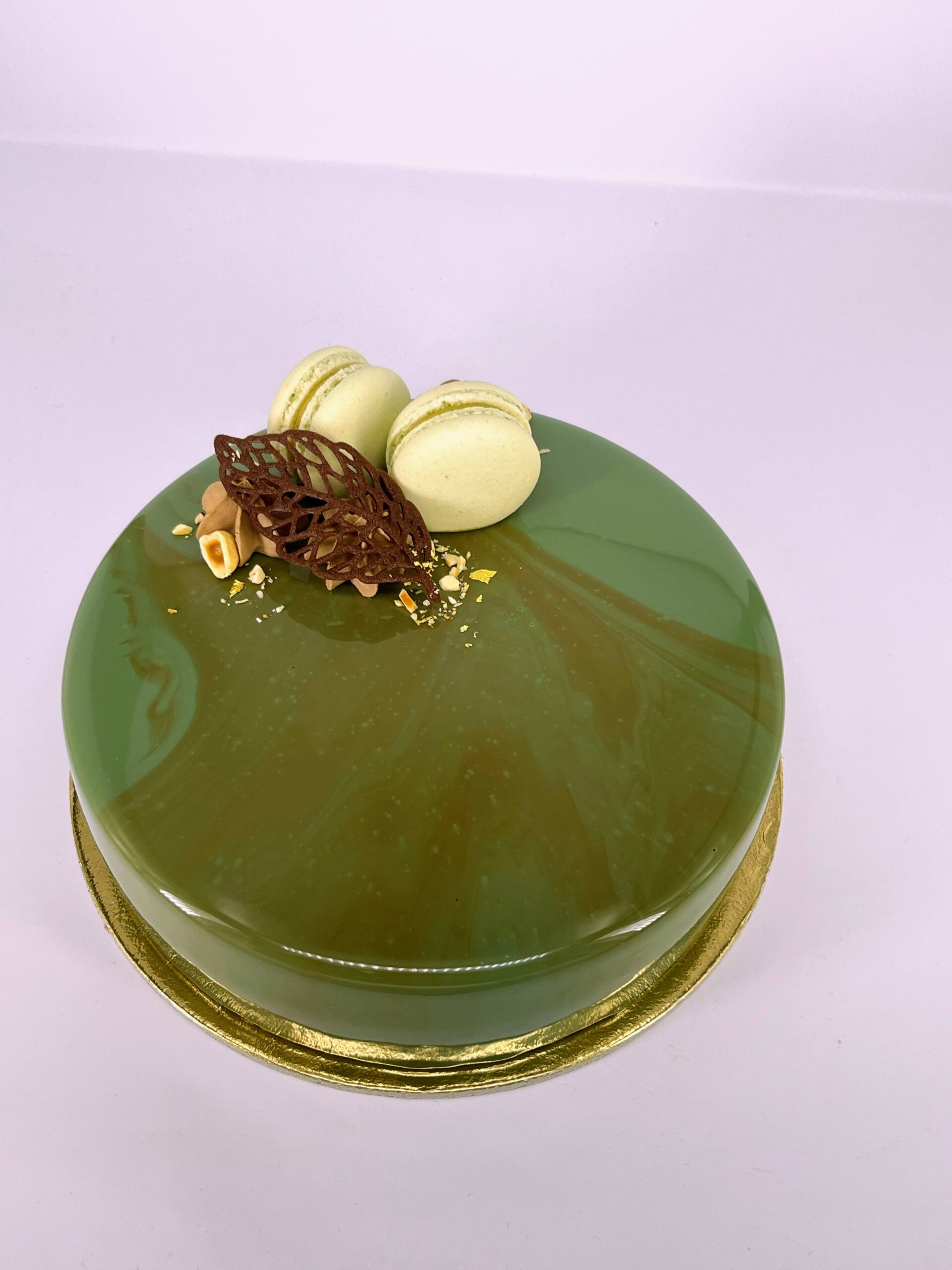 Kakaós piskóta, pisztáciás ropogós réteg, lágy étcsokoládé mousse, végezetül egy igazán pisztáciás pisztácia mousse.